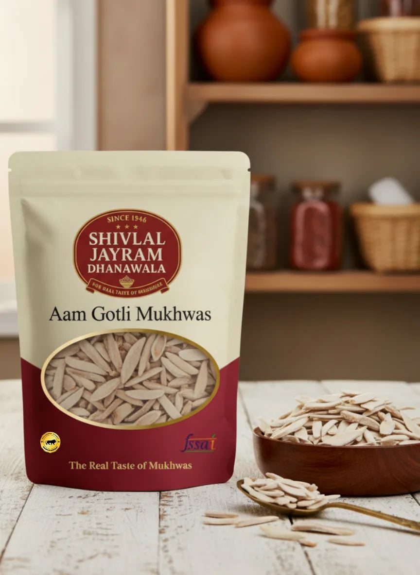 Enjoy the bold taste of Shivlal Jayram Dhanawala’s Aam Gotli Mukhwas – a flavorful burst of mango nostalgia in every bite.