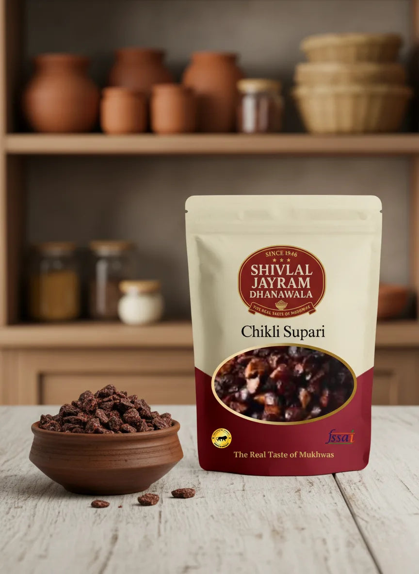 Enjoy the nostalgic flavor of Shivlal Jayram Dhanawala’s Chikli Supari – a crunchy, sweet indulgence with every bite.